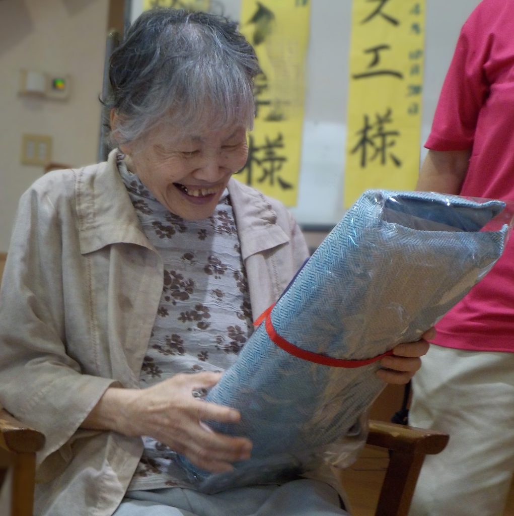 今年のプレゼントはクッションです。 椅子に敷いたり、お部屋で背中に当てたりして使っていただいています。お誕生日カードも添えられています。 それぞれの担当職員から心をこめたメッセージが届けられました。